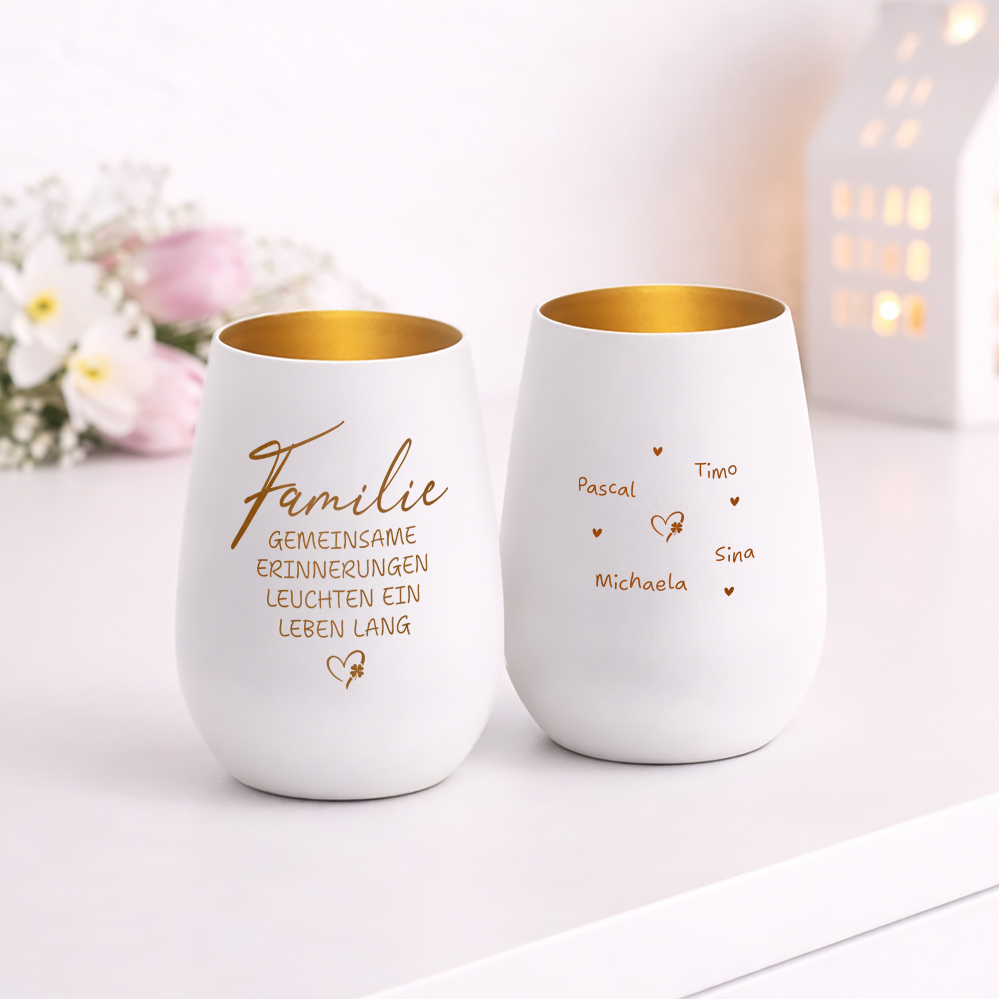 Dieses Windlicht ist ein kleines Zuhause aus Licht. Vorne erinnert der Spruch daran, was wirklich zählt. Hinten stehen eure Namen – auch der Vierbeiner darf mit Pfote mit drauf. Alles ist liebevoll um ein Herz mit Kleeblatt angeordnet. Du wählst weiß oder schwarz sowie gold, silber oder bronze. Wir gravieren es mit Liebe im Schwarzwald und es ist versandbereit in 2–3 Werktagen. ❤️