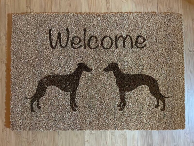 Kokos-Fussmatte mit Windhund Motiv und einem herzlichen „Welcome“