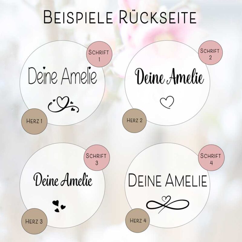 Auf der Rückseite kannst Du einen kleinen Wunschtext, wie z.B. Deine Emilie oder Du bist die Beste – Deine Emilie eingravieren lassen